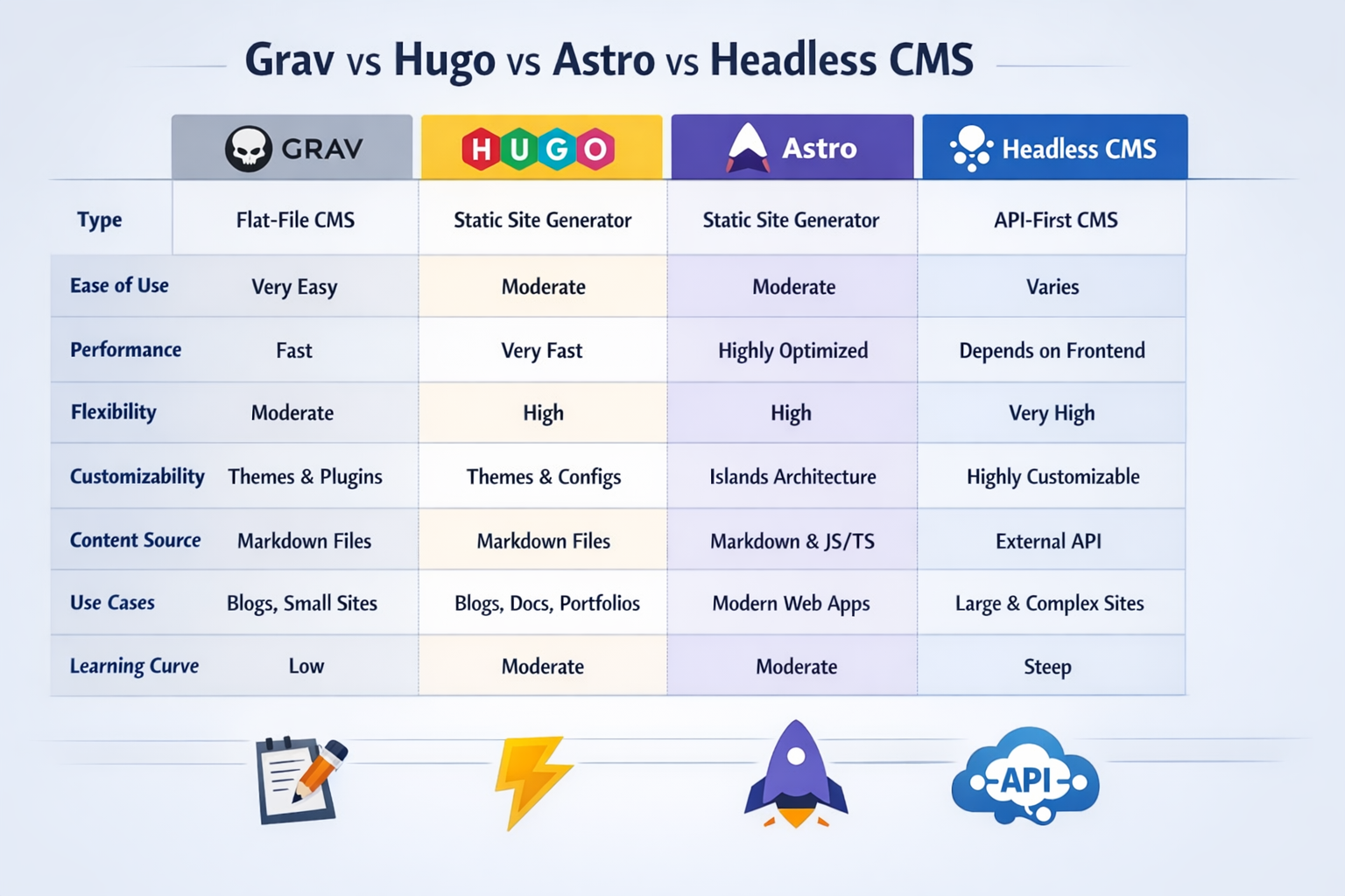 全体比較:Grav vs Hugo vs Astro vs Headless CMS